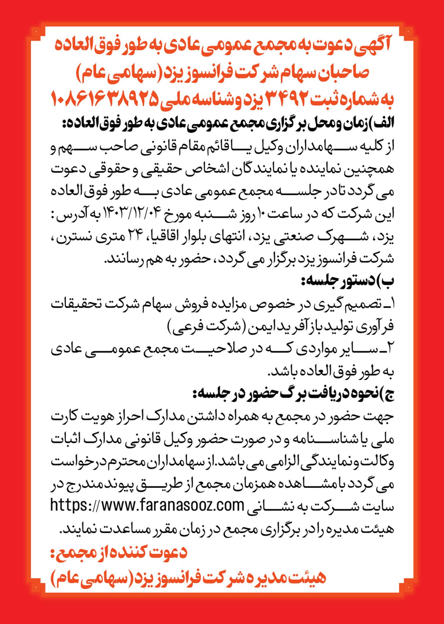 از کلیه سهامداران،وکیل یا قائم مقام قانونی صاحب سهم و همچنین نماینده یا نمایندگان اشخاص حقیقی و حقوقی دعوت می گردد تا در جلسه مجمع عمومی عادی بطور فوق العاده این شرکت که در ساعت 10 روز شنبه مورخ 1403/12/04 به آدرس: یزد، شهرک صنعتی یزد، انتهای بلوار اقاقیا، 24 متری نسترن، شرکت فرانسوز یزد برگزار می گردد، حضور بهم رسانند.